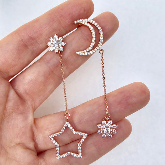 Aretes LARGOS de rodio DE LUNA y ESTRELLA con ZIRCONIAS