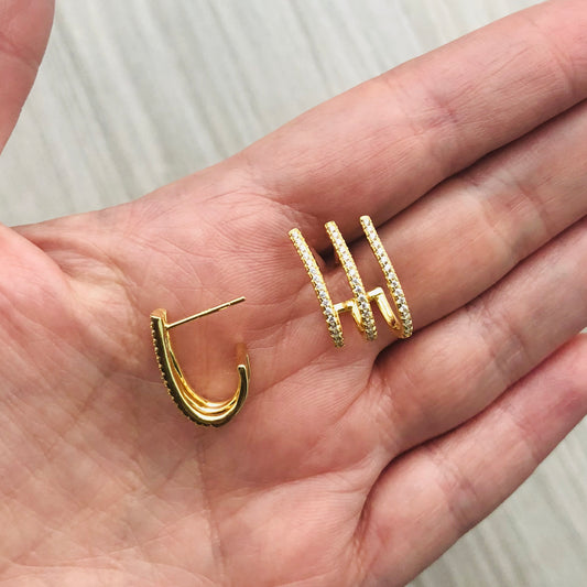 Aretes de PLATA dorados de TRIPLE FILA cubiertos con ZIRCONIAS